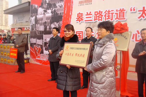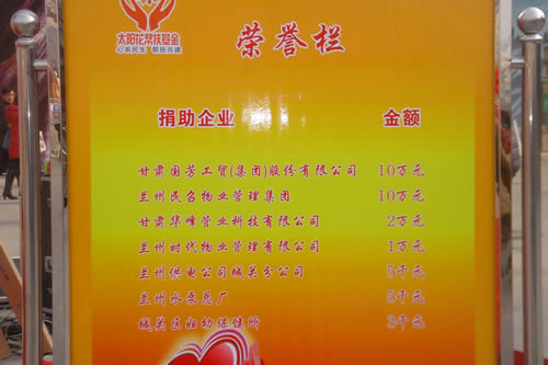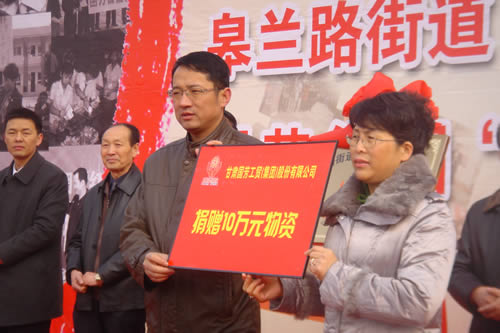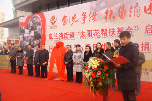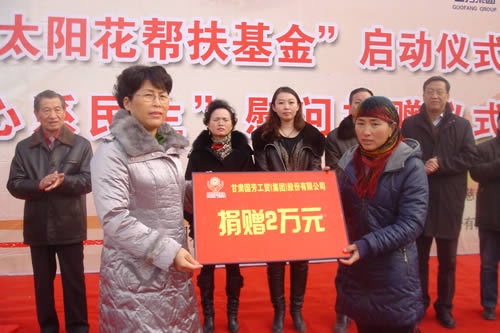 2012元月6日下午3時,甘肅國芳集團聯(lián)合城關(guān)區(qū)皋蘭路街道黨工委、辦事處舉行了“創(chuàng)先爭優(yōu)、扶貧濟困”太陽花幫扶基金啟動儀式,充分體現(xiàn)民生為本的服務(wù)宗旨,著力搭建社會幫扶救助平臺,切實解決弱勢群體實際困難,促進和諧街道建設(shè)。